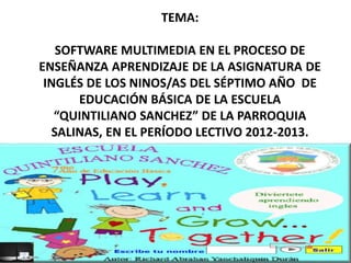 Este documento describe una investigación sobre el uso de software multimedia en la enseñanza del inglés en una escuela en Ecuador. El estudio busca determinar cómo afecta la falta de uso de este tipo de software en el proceso de enseñanza-aprendizaje del inglés. Se aplicaron encuestas a estudiantes y docentes para recopilar datos. Los resultados mostraron que los docentes rara vez usan software multimedia y carecen de capacitación en este tema. Se recomienda que los docentes renueven sus métodos y utilicen más este tipo de recursos tecn
