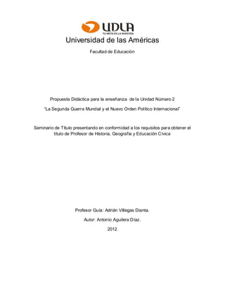 La propuesta didáctica se centra en la enseñanza de la unidad 2 de 1o medio sobre la Segunda Guerra Mundial y el nuevo orden político internacional. El autor analiza propuestas existentes e identifica falencias que busca mejorar mediante la creación de nuevos materiales didácticos impresos y digitales, fundamentados en teorías constructivistas y el método del historiador. Se propone dividir la unidad en varias clases con objetivos, actividades y evaluaciones, además de desarrollar presentaciones y guías de apoyo para el