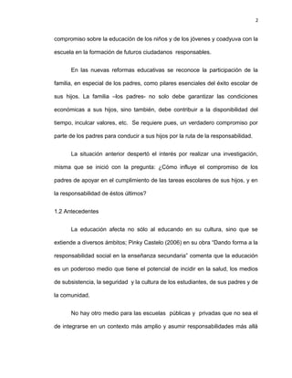 Este documento presenta una introducción a una investigación sobre la influencia del compromiso de los padres en apoyar las tareas escolares de sus hijos y la responsabilidad de estos últimos. Define las variables independiente (compromiso de los padres) y dependiente (responsabilidad de los alumnos), y establece el objetivo general de identificar cómo influye el compromiso de los padres en la responsabilidad de los estudiantes, así como los objetivos y hipótesis específicas. También presenta los antecedentes y límites del estudio.