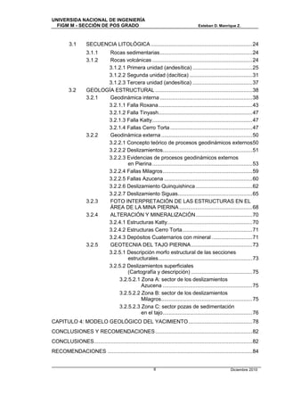 El documento describe la geología estructural del yacimiento aurífero epitermal de alta sulfuración Pierina en Perú. El yacimiento se formó hace entre 14.1-14.7 millones de años en rocas volcánicas del grupo Calipuy depositadas hace 46-23 y 16-13 millones de años. La deformación en Pierina fue causada por procesos geodinámicos internos que formaron las fallas Roxana y Tinyash, y procesos externos que causaron deslizamientos a lo largo de las fallas Azucena y Milagros