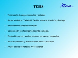 El documento presenta a Tesis S.L., una empresa especializada en el tratamiento de aguas residuales y potables, con experiencia en Galicia y otras regiones de España y Portugal. Ofrecen una variedad de productos y servicios, incluyendo floculantes, coagulantes y antiespumantes, así como optimización de procesos en plantas depuradoras. Su enfoque se centra en resolver problemas como el secado de fangos, generación de espumas y reducción de fósforo, respaldado por acreditaciones de calidad ISO.