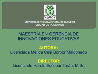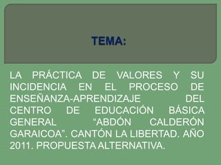 Este documento presenta un resumen de la tesis titulada "La práctica de valores y su incidencia en el proceso de enseñanza-aprendizaje del Centro de Educación Básica General “Abdón Calderón Garaicoa” del Cantón La Libertad, Provincia de Santa Elena, Ecuador, en el año 2011. Propone analizar cómo la aplicación de valores afecta el proceso de enseñanza-aprendizaje en dicho centro educativo.