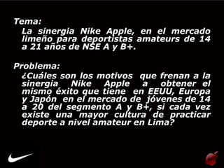 El documento analiza las razones por las que la sinergia entre Nike y Apple para lanzar el producto Nike Plus no ha tenido tanto éxito en Lima, Perú como en otros mercados. Argumenta que la estrategia de marketing actual se enfoca en los corredores de los segmentos A y B+, en lugar de los jóvenes nativos digitales de 14 a 20 años que son el target natural debido a su estilo de vida saludable y constante uso de la tecnología. Propone que una estrategia mejor segmentada y que aproveche las redes sociales podría tener más