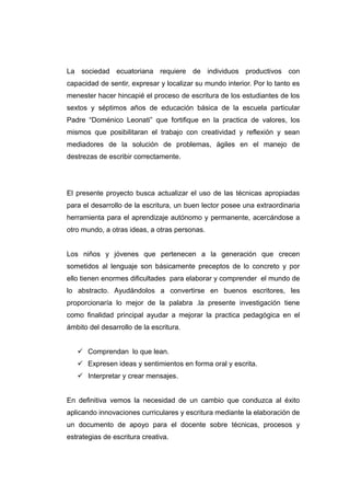 Este documento presenta un resumen de 3 oraciones o menos del capítulo 1 de una tesis sobre la enseñanza de la ortografía en estudiantes de sexto y séptimo grado. El capítulo introduce el problema de investigación al examinar los antecedentes, plantear la pregunta y los objetivos de mejorar la enseñanza de la ortografía. También justifica la investigación y su factibilidad.