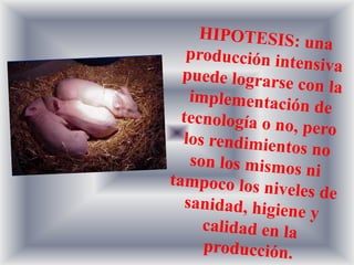 Este documento trata sobre la cría intensiva de cerdos en diferentes sistemas de producción. Analiza los sistemas extensivo, semi-extensivo e intensivo, enfocándose en la producción de cerdas madres. También discute el uso de tecnología en la producción, incluyendo instalaciones, alimentación, inseminación artificial y más. El objetivo es determinar si el uso de tecnología mejora la producción de manera rentable y sostenible.