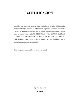 Este documento presenta el seminario de graduación de Robin Cristián Enríquez Ocampos para obtener el título de Ingeniero Civil de la Universidad Técnica de Ambato. El seminario analiza las aguas residuales del barrio Gustavo Andrade y su incidencia en la calidad del agua del estero sin nombre del cantón Lago Agrio de Sucumbíos. El documento incluye una introducción, marco teórico, metodología, análisis de resultados, conclusiones y recomendaciones, y una propuesta.