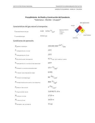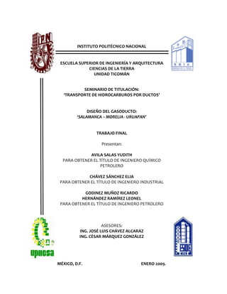 Este documento presenta el diseño de un gasoducto entre las ciudades de Salamanca, Morelia y Uruapan en México. El proyecto incluye el diseño técnico del gasoducto utilizando software especializado, así como un análisis económico para evaluar la viabilidad del proyecto. El objetivo principal es transportar gas natural de manera segura y confiable para beneficiar a las poblaciones a lo largo de la ruta propuesta.