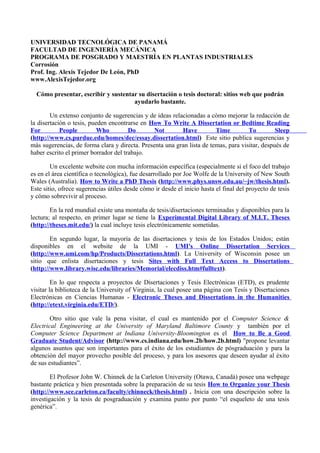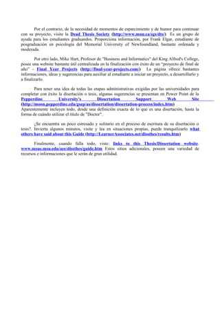 Este documento resume varios sitios web útiles para escribir una tesis o disertación. Proporciona enlaces a sitios que ofrecen sugerencias para la redacción y organización, ejemplos de tesis terminadas, información sobre el proceso administrativo, y recursos para el bienestar emocional durante la escritura. Los sitios cubren temas como la investigación, la estructura, la supervivencia del proceso de posgrado, y cómo completar con éxito un proyecto de tesis o disertación.