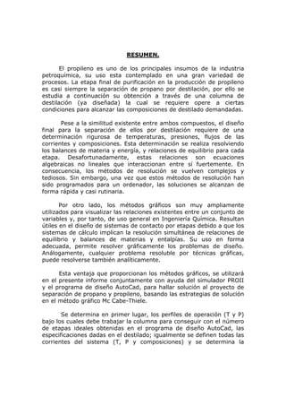 1. El documento describe el proyecto de separación de una mezcla de propano y propileno a través de destilación. Se estudian tres casos diferentes para lograr la separación y obtener propileno de alta pureza.