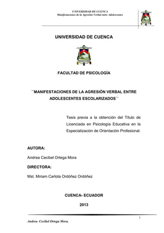 Este documento presenta los resultados de una investigación sobre las manifestaciones de la agresión verbal entre adolescentes escolarizados. El estudio analizó las principales formas en que se expresa la agresión verbal, los espacios y momentos donde ocurre con más frecuencia, y las consecuencias para las víctimas. La investigación se llevó a cabo aplicando cuestionarios a estudiantes y entrevistas a profesores de un colegio en Cuenca, Ecuador. Los resultados mostraron que el patio y el aula son los lugares donde más comúnmente se produce la victimiz