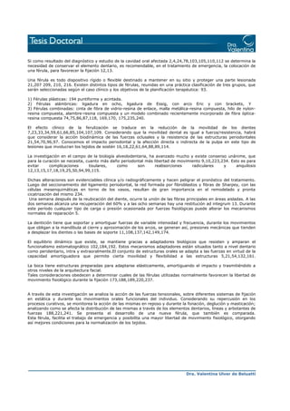 El documento describe diferentes tipos de férulas utilizadas en el tratamiento de traumatismos dentarios. Se clasifican las férulas en plásticas, alámbricas y combinadas. Las férulas plásticas incluyen las acintadas y puntiformes realizadas con resina compuesta, mientras que las alámbricas se construyen con alambre y pueden ser ligadura en ocho, de Essig o con arco Eric. Las férulas combinadas aprovechan las cualidades de diferentes materiales como resina compuesta con cinta de fibra de vidrio