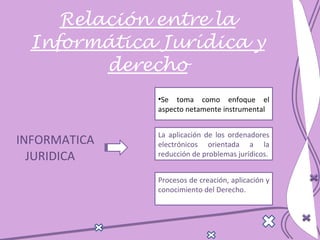 El documento describe las relaciones entre la informática jurídica, la teoría general de sistemas y la cibernética. Explica que la informática jurídica aplica técnicas informáticas a la documentación jurídica para analizar, archivar e indexar información legal. También cubre las ramas de la informática jurídica documental y de gestión. Luego, discute cómo la teoría general de sistemas y la cibernética se aplican al derecho, al estudiar los sistemas jurídicos y sus interacciones. Finalmente