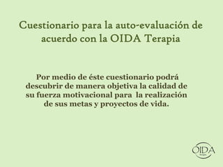 Este cuestionario evalúa la calidad de la motivación de una persona para lograr sus metas y proyectos de vida a través de 15 preguntas de opción múltiple. Ofrece retroalimentación basada en las respuestas, sugiriendo mejoras cuando los propósitos no son puros o benefician a otros. El propósito es ayudar a las personas a descubrir su verdadero potencial a través de metas altruistas y espiritualmente significativas.