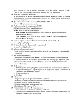 El documento contiene 35 preguntas sobre conceptos básicos de hardware y software, así como componentes internos y externos de una computadora. Algunas preguntas identifican y definen dispositivos de almacenamiento, tarjetas de expansión, conectores y puertos comunes. Otras preguntas tratan sobre funciones de la motherboard, características de fuentes de poder, tipos de memoria RAM y roles del software y hardware.