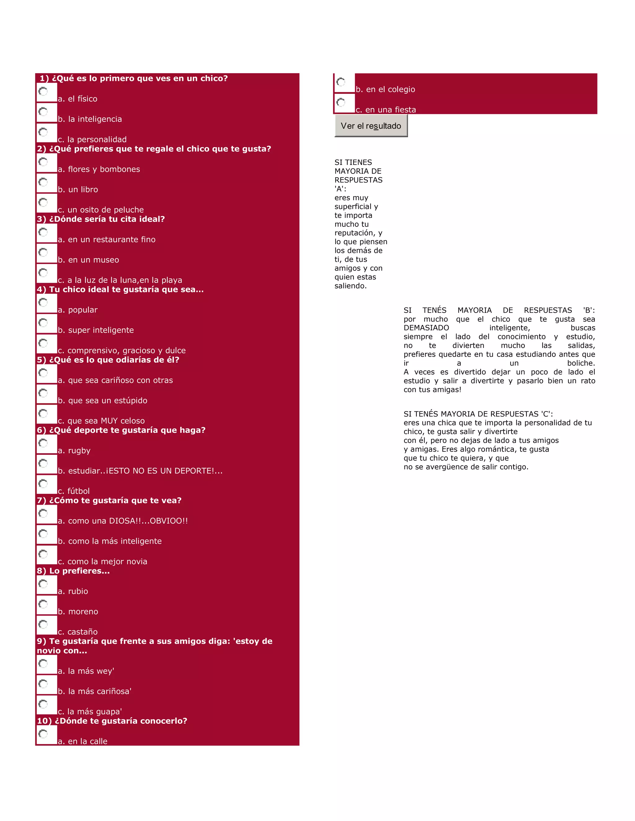 Este documento presenta una serie de preguntas sobre las preferencias de una chica en relación a los chicos, citas, deportes y cómo le gustaría ser vista por su novio. Dependiendo de si la mayoría de las respuestas son A, B o C, ofrece una breve descripción de la personalidad de la chica. Si elige mayormente A, parece ser una chica superficial. Si elige B, le interesa el conocimiento pero también divertirse. Si elige C, le importa la personalidad y pasar tiempo de calidad.