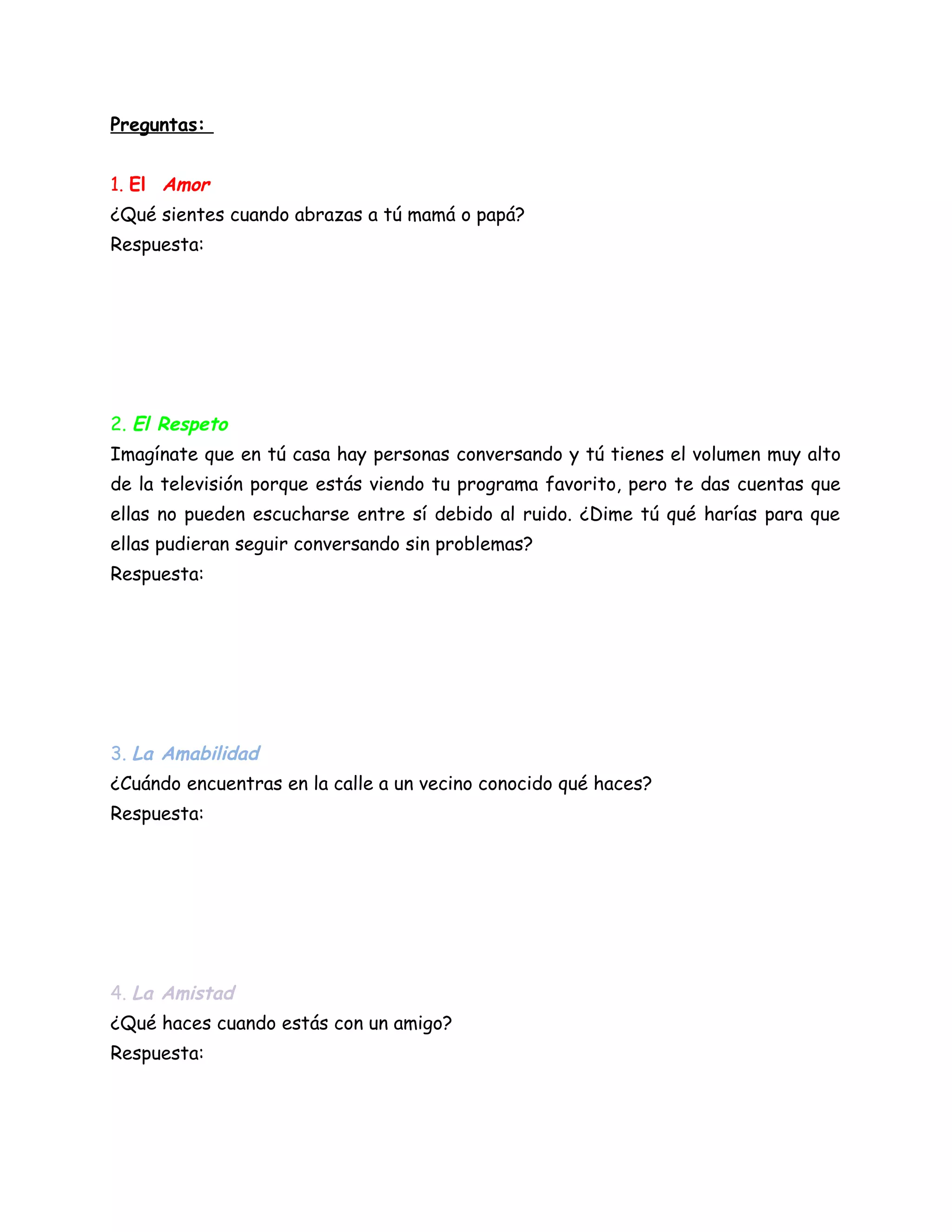 Este documento presenta 11 preguntas sobre valores como el amor, el respeto, la amabilidad, la amistad, la generosidad, la honestidad, la perseverancia, la prudencia, la responsabilidad, la superación y la tolerancia. Las preguntas están dirigidas a niños y buscan explorar cómo demuestran y comprenden estos valores a través de ejemplos cotidianos en sus vidas.