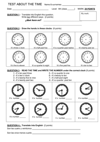 Este documento contiene un examen sobre la hora en inglés y español con 4 preguntas. La primera pregunta pide traducir "¿Qué hora es?" al inglés de dos formas diferentes. La segunda pregunta pide dibujar las manecillas en 8 relojes a diferentes horas. La tercera pregunta pide leer la hora escrita y escribir el número correspondiente debajo del reloj correcto. La cuarta pregunta pide traducir dos expresiones de hora al inglés.