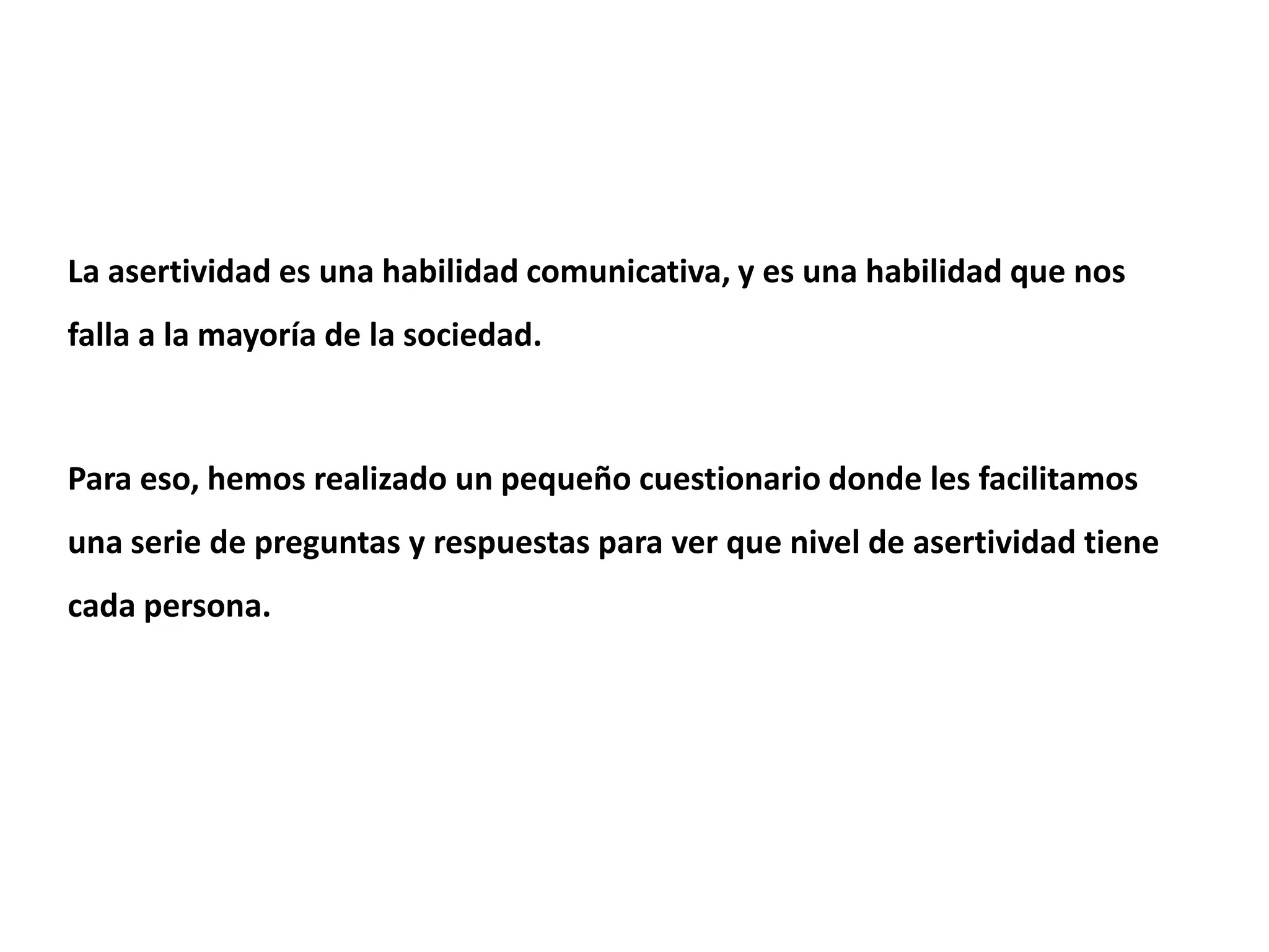 Este documento presenta un cuestionario de 13 preguntas sobre cómo responder de manera asertiva en diferentes situaciones sociales. Dependiendo de si la mayoría de las respuestas son de tipo A, B o C, indica si la persona tiene un nivel de asertividad alto, medio o bajo. Un nivel alto significa que la persona es asertiva, un nivel medio que es pasiva, y un nivel bajo que es agresiva. El cuestionario busca ayudar a las personas a mejorar su comportamiento y relacionarse de forma más positiva con los demás.