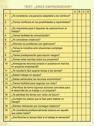 El documento presenta un cuestionario para evaluar las características de una persona emprendedora, asignando puntuaciones a las respuestas sobre diversas habilidades y actitudes relacionadas con el emprendimiento. Los resultados se clasifican en tres categorías: alto potencial emprendedor (60 o más puntos), características adecuadas con áreas de mejora (30 a 59 puntos), y baja disposición emprendedora (menos de 30 puntos), sugiriendo acciones para cada caso. Se enfatiza la importancia de la autovaloración y el desarrollo de hábitos emprendedores para quienes desean iniciar un negocio.