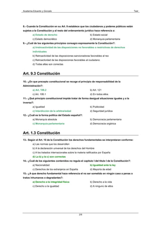 El documento contiene 41 preguntas de un examen sobre organización del estado español y derechos fundamentales según la Constitución española. Las preguntas abarcan temas como la estructura y contenido de la Constitución, los principios del estado de derecho, derechos y libertades fundamentales como la detención, registro domiciliario y derecho a la tutela judicial, y los mecanismos de reforma constitucional.