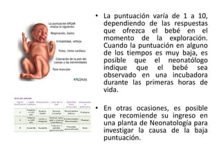 El documento describe el test de Apgar, el cual evalúa la condición de un recién nacido en cinco categorías: frecuencia cardíaca, esfuerzo respiratorio, tono muscular, reflejo de irritabilidad y coloración de la piel. Se asigna un puntaje de 0, 1 o 2 en cada categoría para determinar el estado general del bebé. Un puntaje alto indica que el bebé está sano, mientras que uno bajo requiere atención médica inmediata.