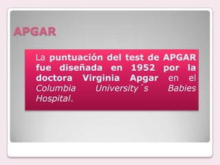 El documento describe el test APGAR, una prueba de evaluación del estado de un recién nacido. Se realiza en el primer y quinto minuto después del nacimiento midiendo la frecuencia cardíaca, esfuerzo respiratorio, tono muscular, reflejos e coloración de la piel. Una puntuación alta indica un buen estado, mientras que una baja requiere atención médica inmediata. El test ayuda a los médicos a determinar el tipo de asistencia necesaria y ha contribuido a reducir la mortalidad infantil.