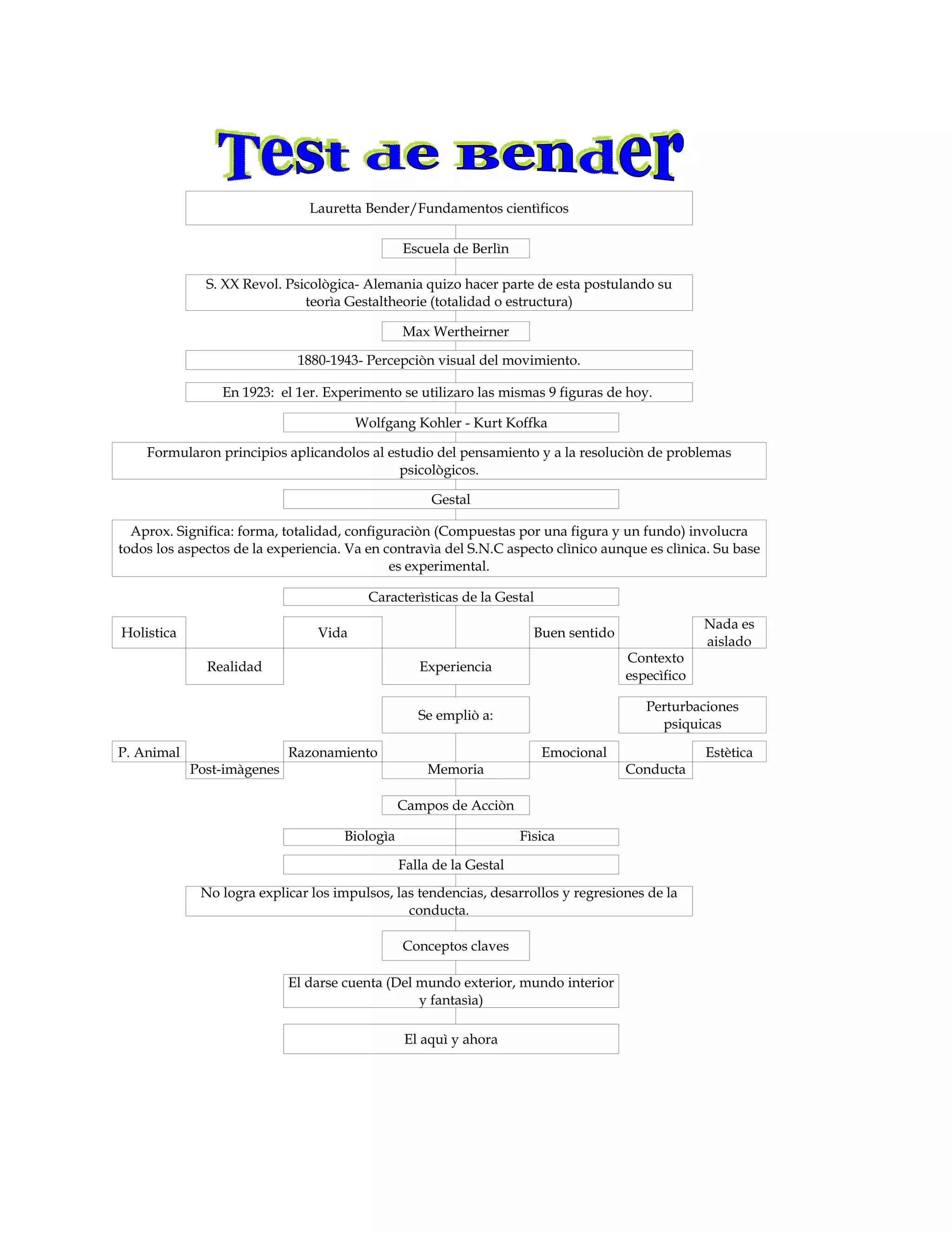 Este documento describe el Test de Bender, un test psicológico gestáltico desarrollado por Lauretta Bender en 1938 para evaluar la maduración neuromotriz y detectar posibles trastornos orgánicos. El test consiste en copiar nueve figuras geométricas. A través del análisis de las reproducciones se pueden identificar indicadores de distorsión, rotación, integración y perseveración que sugieren problemas en la estructuración perceptual. El documento explica los procedimientos de aplicación e interpretación del test así como sus aplicaciones clínic