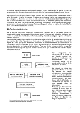 El documento describe el Test de Bender-Koppitz, un test psicológico que evalúa la madurez perceptiva y la integración visomotriz en niños. Consiste en copiar 9 figuras abstractas. Se explican los fundamentos teóricos, las normas de aplicación y corrección, e interpretación de resultados. El test puede revelar posibles disfunciones perceptivas, ser usado como test de personalidad o para detectar problemas de aprendizaje.