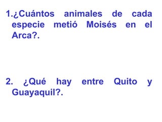 Este documento contiene 10 preguntas con respuestas cortas sobre temas bíblicos, geográficos e históricos. Las preguntas van desde quién construyó el Arca hasta cuántos meses tienen 28 días y qué fue lo último que hizo Napoleón. Las respuestas son breves y van desde correcciones sobre detalles bíblicos hasta explicaciones simples.