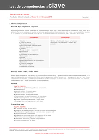 Este documento presenta los resultados de una prueba de competencias realizada por Marta Clemente Bruna. Muestra su perfil de competencias destacadas como la empatía, la comunicación y la preocupación por el orden y la calidad. También analiza sus puntos fuertes como la iniciativa, la orientación al logro y la planificación, así como áreas para mejorar como la priorización de tareas. El resumen proporciona información sobre su desempeño en relación con el promedio de la población y ofrece comentarios sobre hábitos positivos y áreas de
