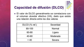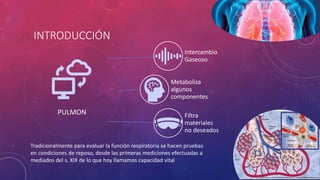 Este documento describe la función pulmonar y la espirometría. Explica que la espirometría mide volúmenes y flujos pulmonares para diagnosticar y monitorear trastornos respiratorios. Detalla que la capacidad vital forzada y el volumen espirado en el primer segundo son medidas clave y que la relación entre ellas distingue patrones obstructivos vs restrictivos. También explica cómo las curvas volumen-tiempo y flujo-volumen ayudan a interpretar los resultados espirométricos.