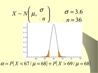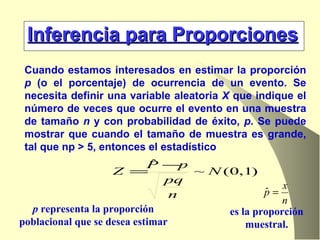 El documento presenta los conceptos básicos de la inferencia estadística, incluyendo estimación de parámetros, pruebas de hipótesis, intervalos de confianza y tipos de errores. Explica el procedimiento general para realizar pruebas de hipótesis, incluyendo la definición de hipótesis nula y alternativa, selección del nivel de significancia y estadístico de prueba, y criterios de decisión. También cubre pruebas para medias y proporciones de una y dos poblaciones.