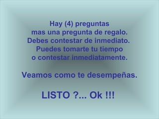 Este documento presenta un examen de 4 preguntas y una pregunta de regalo para evaluar la demencia. La primera y segunda pregunta intentan evaluar la capacidad de razonamiento lógico al pedir que se analice la posición en una carrera después de rebasar a otros corredores. La tercera pregunta evalúa las habilidades matemáticas al pedir calcular mentalmente sumas repetidas. La cuarta pregunta busca evaluar la comprensión lectora. La pregunta de regalo prueba la capacidad de resolver problemas no verbales.
