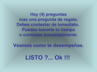 Este documento presenta un examen de 4 preguntas y una pregunta de regalo para evaluar la demencia. La primera y segunda pregunta intentan evaluar la capacidad de razonamiento lógico al pedir que se analice la posición en una carrera después de rebasar a otros corredores. La tercera pregunta evalúa las habilidades matemáticas al pedir calcular mentalmente sumas repetidas. La cuarta pregunta pide identificar el nombre de la quinta hija de una familia, intentando evaluar la comprensión lectora. La pregunta de regalo