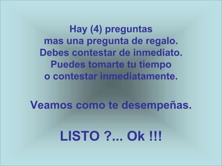 Este documento presenta un examen de demencia con 4 preguntas y una pregunta de regalo. En cada pregunta, la respuesta correcta se revela después de que el paciente responde, mostrando si la respuesta fue correcta o incorrecta. El propósito es evaluar las habilidades cognitivas del paciente mediante preguntas diseñadas para confundir o inducir a error.