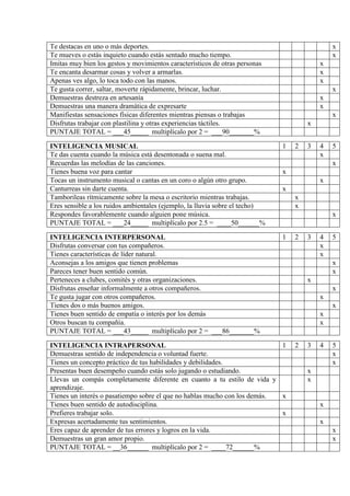 Este documento presenta los resultados de una evaluación de inteligencias múltiples realizada a una persona. La evaluación consistió en un test de 90 preguntas clasificadas en 9 tipos de inteligencia. Los resultados mostraron que las inteligencias mejor desarrolladas de la persona son la lógico-matemática, físico-kinestésica e interpersonal. Adicionalmente, el documento provee una breve descripción de cada tipo de inteligencia evaluada.