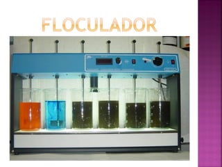 Este documento describe el test de jarras, un proceso utilizado para eliminar partículas en disolución que pueden causar turbidez u otros cambios en el efluente. Explica que el test simula el proceso de coagulación/floculación y los parámetros a considerar como el pH, reactivos, tiempo de agitación y sedimentación para formar lodos mediante precipitación. También cubre la oxidación de sustancias orgánicas y el cumplimiento de normatividad ambiental.