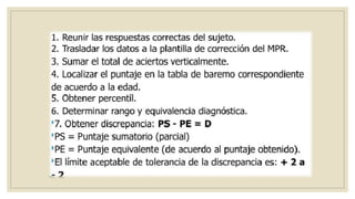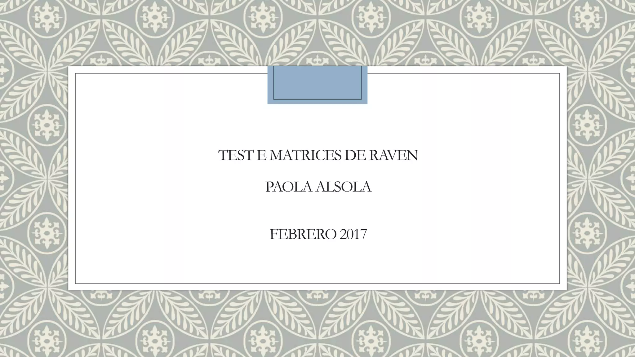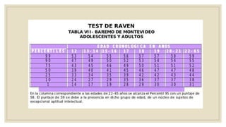 El Test de Matrices Progresivas de Raven es una herramienta diseñada para evaluar la inteligencia a través de 60 matrices incompletas organizadas en cinco grupos que varían en complejidad. Mide habilidades como el razonamiento analógico y la percepción espacial, exigiendo al sujeto completar figuras y hacer comparaciones lógicas. La prueba proporciona información sobre la claridad de pensamiento y la capacidad de organizar información desorganizada.