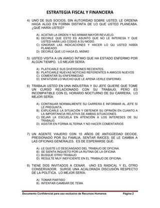 Este documento presenta un test de liderazgo con 25 preguntas de opción múltiple. Cada pregunta describe una situación laboral o interpersonal y ofrece 4 posibles respuestas sobre cómo manejarla. El objetivo es evaluar la capacidad de los candidatos para tomar decisiones acertadas en diferentes escenarios.