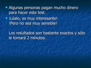 Este documento presenta un supuesto test de personalidad de 10 preguntas con respuestas múltiples. Al final, se asignan puntajes a las respuestas para indicar cómo otros podrían ver la personalidad de la persona según los resultados. Los puntajes se dividen en 6 rangos, desde más de 60 puntos hasta menos de 21 puntos, asociados a características como dominante, impulsivo, animado, prudente, nervioso y tímido. Se pide enviar el test a otros con el puntaje obtenido en el asunto.