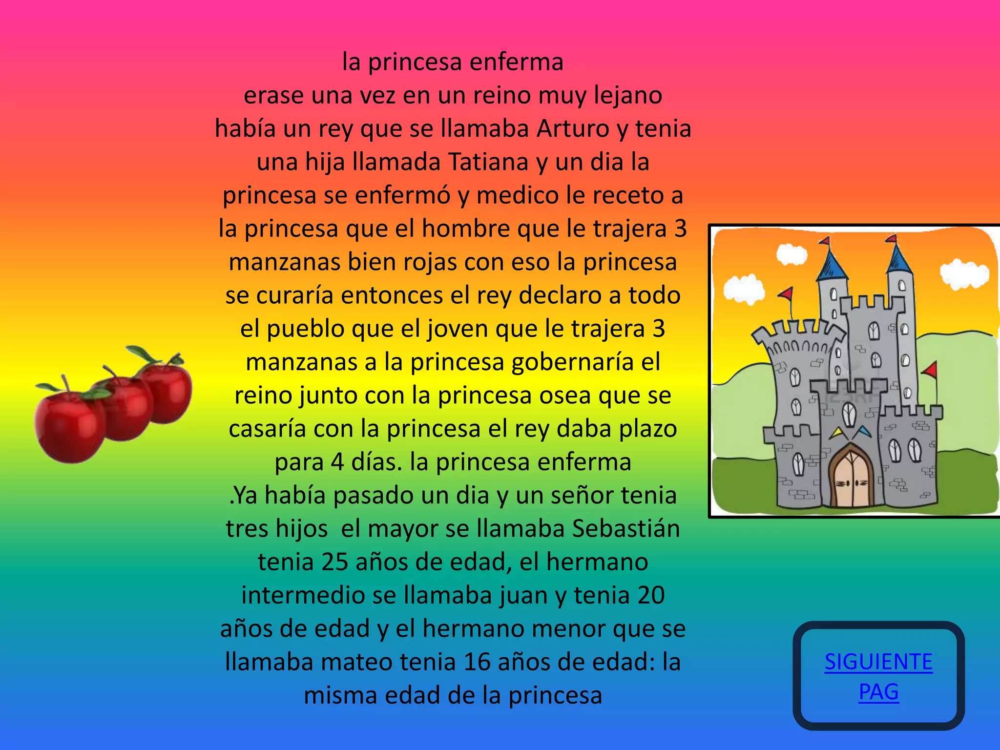 La historia trata sobre una princesa llamada Tatiana que enfermó. El médico dijo que solo se curaría si le llevaban 3 manzanas rojas. El rey ofreció la mano de la princesa y el reino al joven que lograra esta tarea. Tres hermanos lo intentaron pero solo el menor, Mateo, tuvo éxito gracias a la ayuda de un anciano y se casó con la princesa.