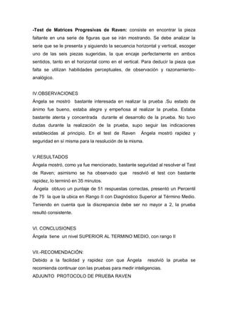 El resumen evalúa los resultados del Test de Raven realizado a Ángela de 20 años. Ángela completó el test rápidamente en 35 minutos y obtuvo 51 respuestas correctas, ubicándose en el percentil 75, lo que indica un nivel de inteligencia superior al promedio. La evaluadora concluyó que Ángela tiene habilidades de razonamiento y resolución de problemas por encima del nivel promedio.