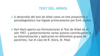 El documento describe el Test del Árbol como una herramienta proyectiva y psicodiagnóstica que evalúa la vida interior, traumas y relaciones del sujeto a través de un dibujo de un árbol. Se analiza la simbología de diferentes partes del árbol (tronco, copa, ramas, raíces) y su relación con aspectos psicológicos y emocionales del individuo. Además, se menciona la importancia del Índice de Wittgentein para medir la altura del árbol en relación con la edad y posibles traumas en el desarrollo.