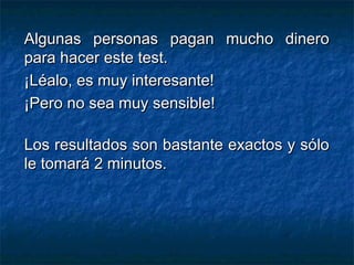 El documento presenta un cuestionario de 10 preguntas sobre hábitos y preferencias personales. Los participantes deben responder las preguntas y sumar sus puntos para obtener una evaluación de cómo los demás podrían ver su personalidad, la cual se categoriza en escalas de 21-30 puntos, 31-40 puntos, 41-50 puntos y 51-60 puntos o más de 60 puntos.