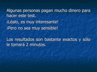 Este documento presenta un supuesto test de personalidad de 10 preguntas con varias opciones de respuesta para cada pregunta. Al final, instruye al lector a sumar los puntos de sus respuestas para determinar su puntaje total y la descripción de personalidad asociada a ese puntaje según rangos de puntos del 21 al 60. El objetivo es que el lector comparta el test con otros después de completarlo y reportar su puntaje en el asunto del correo electrónico.
