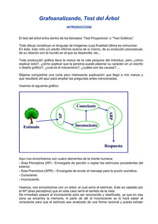 El documento presenta una introducción al test del árbol como un test proyectivo que permite conocer aspectos inconscientes de la persona a través de su dibujo de un árbol. Explica que el árbol simboliza el crecimiento y desarrollo personal, y que su interpretación debe considerar factores como la forma, tamaño y estructura del dibujo. También resume los orígenes y aplicación práctica del test, el cual pide al sujeto dibujar primero un árbol y luego tres árbol para profundizar en su análisis
