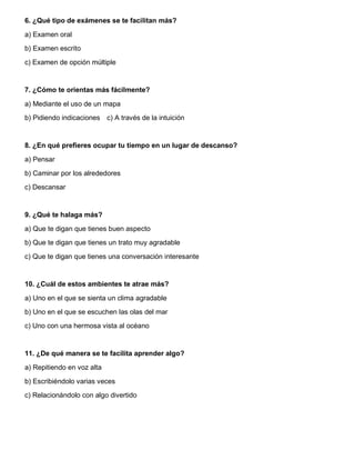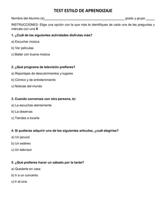 Este documento presenta un test de estilos de aprendizaje compuesto por 40 preguntas con 3 opciones cada una (visual, auditivo, kinestésico). El objetivo es que el alumno marque con una X la opción con la que más se identifique en cada pregunta para luego sumar las respuestas verticalmente y determinar su estilo de aprendizaje predominante. Al final se evalúan los resultados para identificar si el canal perceptual visual, auditivo o kinestésico es el más fuerte.