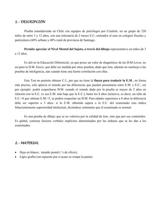 Este resumen describe el Test Fay, una prueba estandarizada chilena que evalúa el nivel mental de niños de 3 a 12 años a través de su habilidad para dibujar una escena dictada. La prueba fue aplicada a 220 niños de colegios urbanos y rurales y permite diagnosticar retrasos mentales leves. El examinado recibe una hoja en blanco y lápiz y se le pide dibujar "Una señora pasea en la calle y está lloviendo". La calidad del dibujo y los detalles incluid