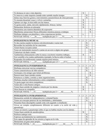 Este documento presenta un test de inteligencias múltiples para evaluar las distintas habilidades e intereses de una persona. El test evalúa 8 tipos de inteligencia y pide al participante calificar afirmaciones en una escala del 1 al 5. Luego calcula el puntaje total en cada área y lo convierte a un porcentaje para determinar la inteligencia dominante. Los resultados muestran que la inteligencia lógico-matemática obtuvo el puntaje más alto, seguida de las inteligencias lingüística y musical. El documento también resume bre