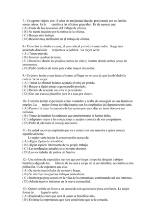 Este documento presenta un test de 30 preguntas sobre habilidades interpersonales y de liderazgo. Cada pregunta describe un escenario y cuatro posibles respuestas. El objetivo del test es evaluar la capacidad de las personas para tomar decisiones efectivas que consideren el lado humano de las situaciones laborales y de gestión. El test busca medir habilidades como la supervisión, la toma de decisiones en relaciones humanas, la evaluación de problemas interpersonales y el establecimiento de relaciones positivas.